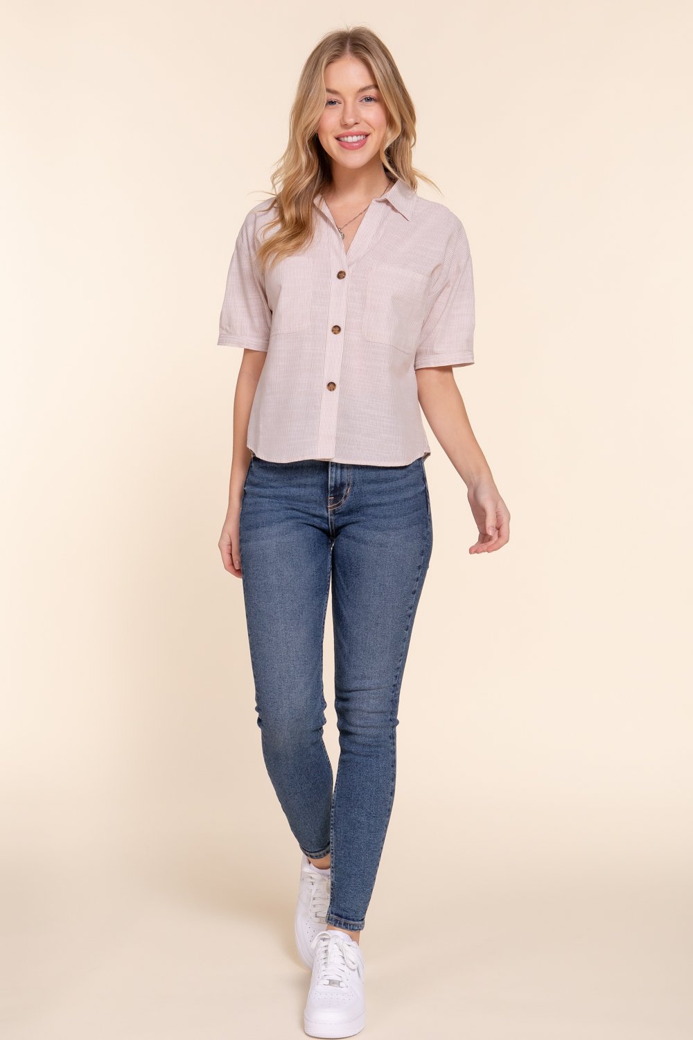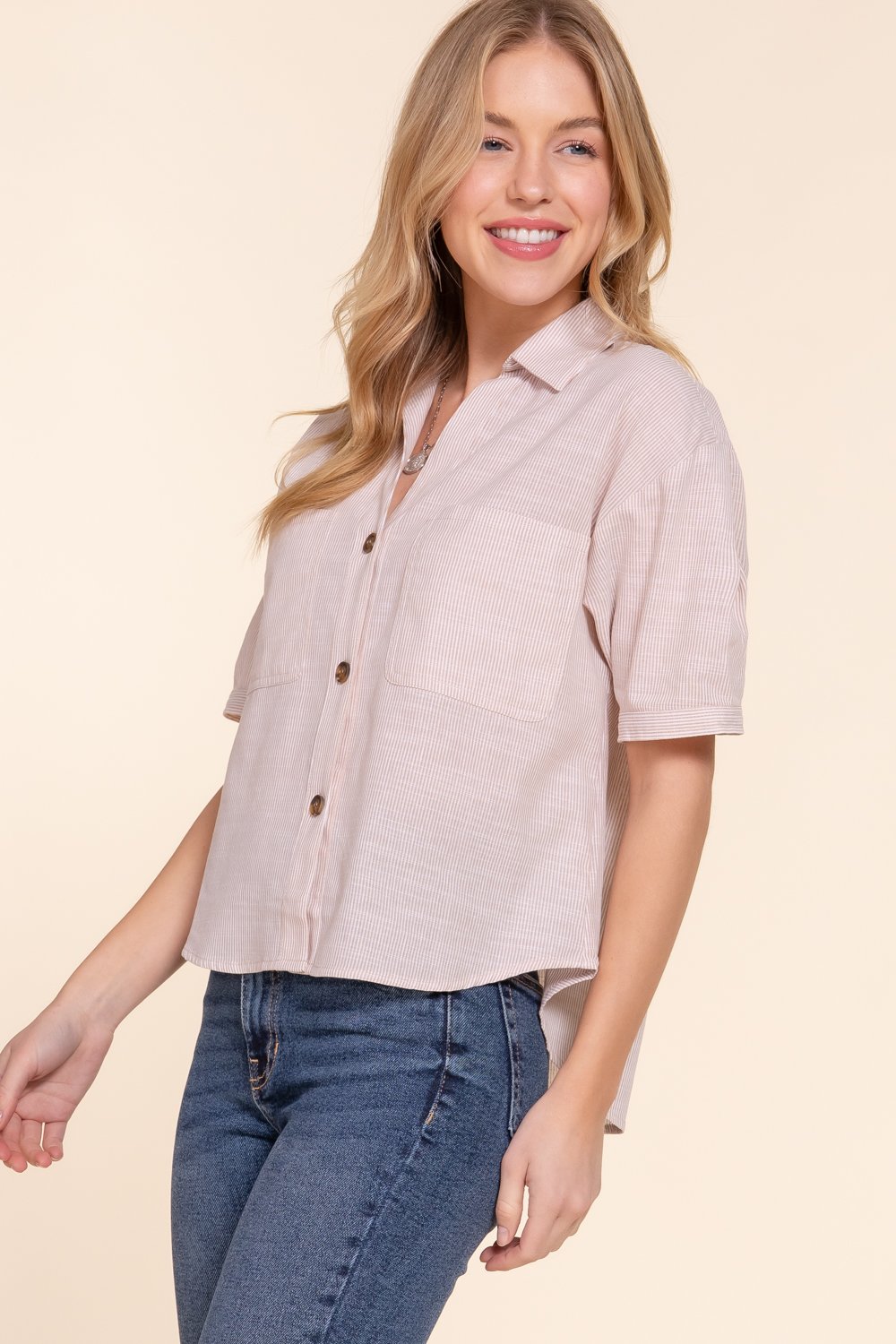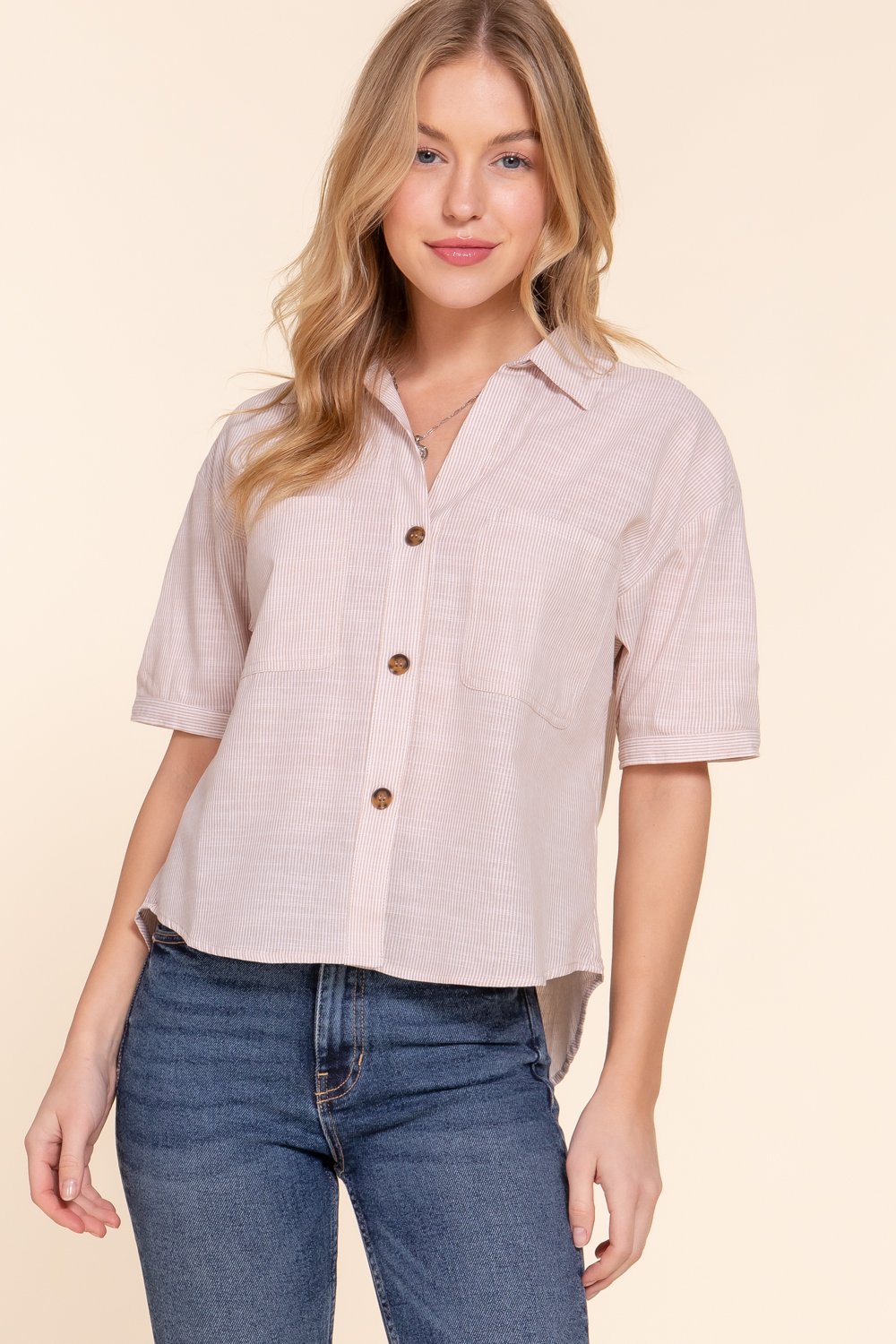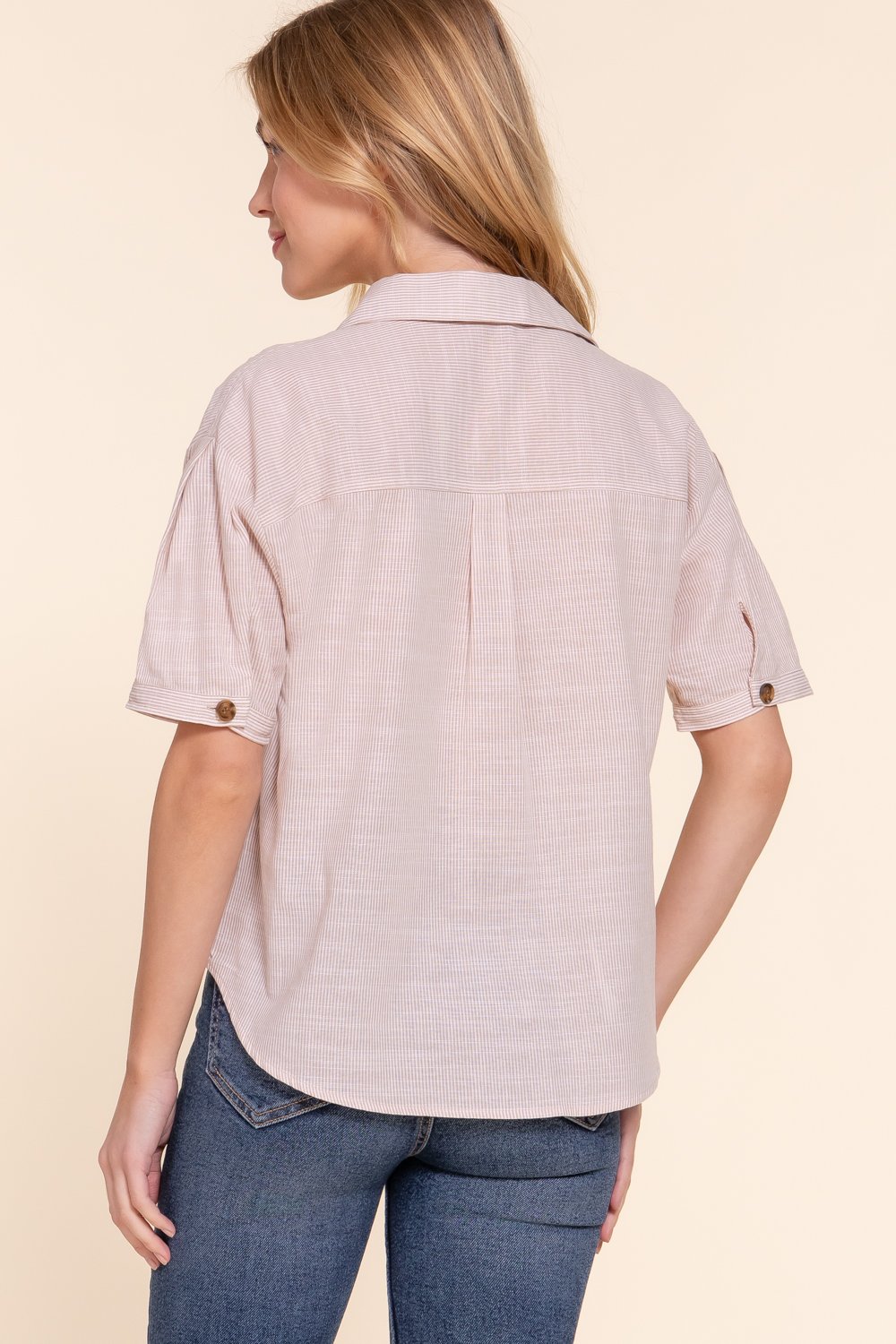 TEJIDO DE RAYAS Y/D 100 % ALGODÓN, CAMISA DE MANGA CORTA CON BOLSILLO DELANTERO Y BOTONES A RAYAS, Talla S, M, L.