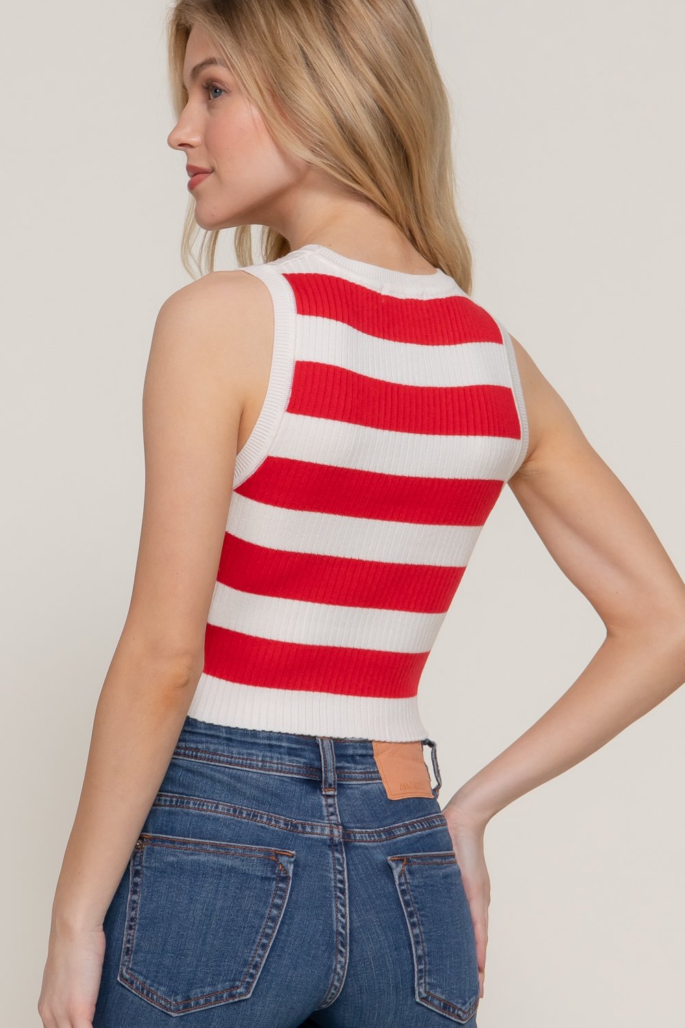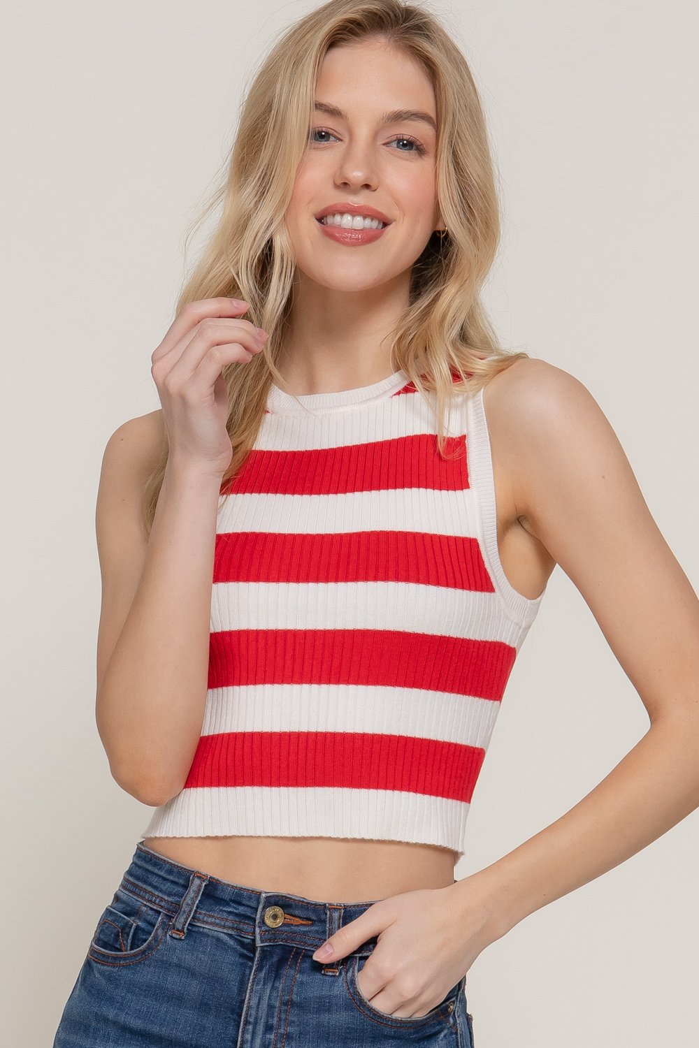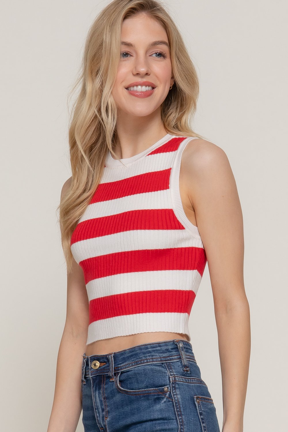 Composición de la tela TELA: SUÉTER 88 % ACRÍLICO 12 % ELASTANZA Descripción Suéter de primavera a rayas con cuello redondo y sin mangas. Talla y proporción: S, M, L
