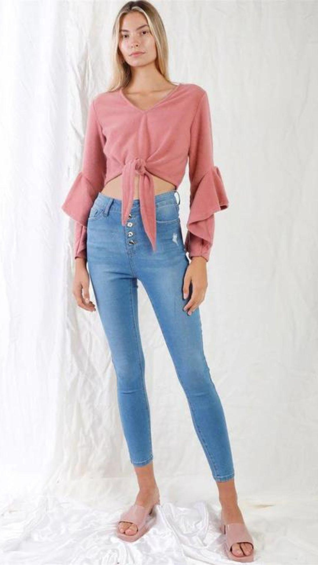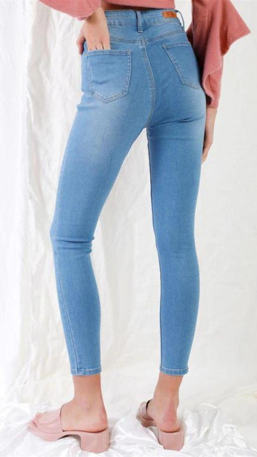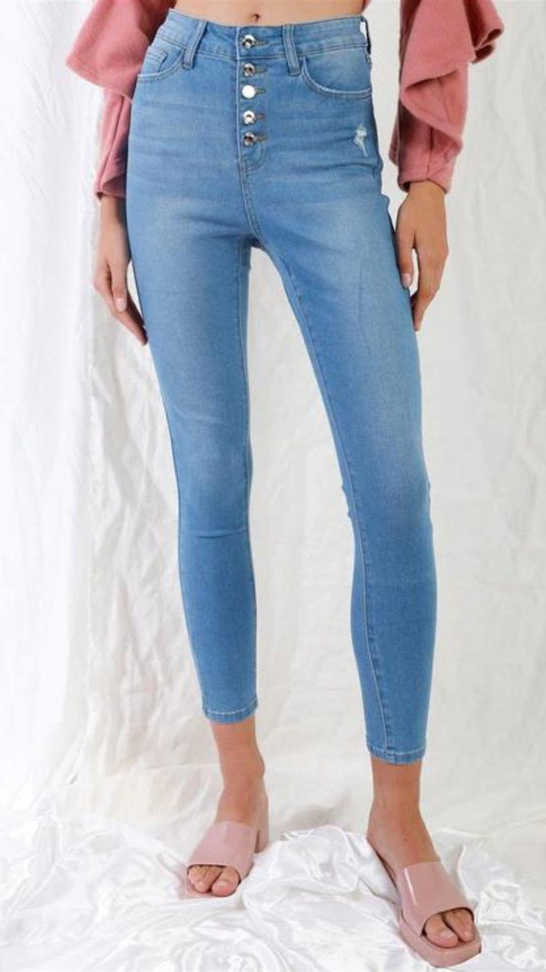 Tela 74% Algodón, 24%. Poliéster, 2% Elastano Vaqueros ajustados de cintura alta con botones y bragueta azul claro. Tallas 1-3-5-7-9-11-13